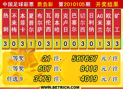 �����й������Ʊ��10105�ڿ���������һ�Ƚ�21ע��ÿע567637Ԫ�����Ƚ�607ע��ÿע8416 Ԫ����������26608012Ԫ����ѡ9������������һ�Ƚ�3473ע��ÿע4019Ԫ���������� 21814780Ԫ��