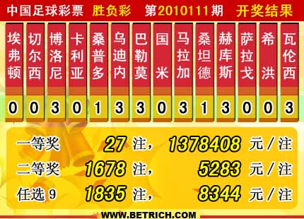 �����й������Ʊ��10111�ڿ���������һ�Ƚ�27ע��ÿע����1378408Ԫ�����Ƚ�1678ע��ÿע����5283Ԫ������ʤ��������46179180Ԫ������165,287,59Ԫ���潱�ء���ѡ9������������һ�Ƚ�1835ע��ÿע����8344Ԫ���������� 23924370Ԫ��