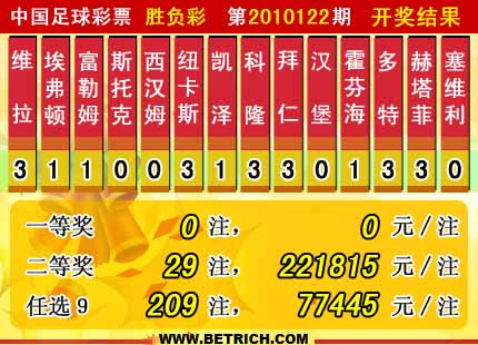 �����й������Ʊ��10122�ڿ���������һ�Ƚ������г���15009545.6��������ͷ�����أ����Ƚ�29ע��ÿע221815Ԫ������ʤ����ȫ��������Ϊ33503450Ԫ����ѡ9������������һ�Ƚ�209ע��ÿע77445Ԫ�����ڱ�����ѡ9��ȫ��������25290912Ԫ��