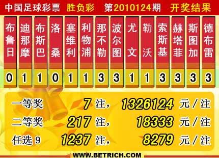 �����й������Ʊ��10124�ڿ���������һ�Ƚ�7ע��ÿע1326124Ԫ�����Ƚ�217ע��ÿע18333Ԫ����������20720696Ԫ����ѡ9������������һ�Ƚ�1237ע��ÿע8279Ԫ����������16003064Ԫ��