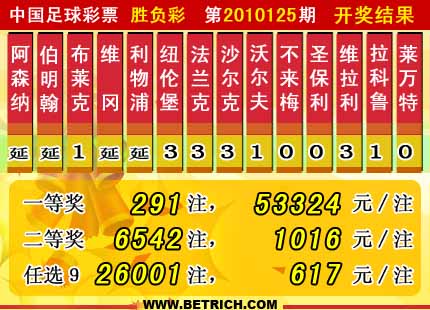 �����й������Ʊ��10125�ڿ���������һ�Ƚ�291ע��ÿע����53324Ԫ�����Ƚ�6542ע��ÿע1016Ԫ������ʤ����ȫ��������Ϊ34637392Ԫ���������ڵ��ij�Ӣ������ά��VSά����������VS���ա�������VSŦ��˹������ɭ��VS˹�п˳ǰ��κν������Լ��㡣��ѡ9������������һ�Ƚ�26001ע��ÿע����617Ԫ����ѡ�ų���������25072966Ԫ��