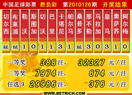 �����й������Ʊ��10126�ڿ���������һ�Ƚ�388ע��ÿע����32327Ԫ�����Ƚ�7974ע ��ÿע674Ԫ������ʤ����ȫ��������Ϊ27997816Ԫ������������ڵ����������ж���VS��������������VS�ȴ̡�ɣ��VS�����ǰ��κ�Ͷע�������Լ��㡣��ѡ9������������һ�Ƚ�29986ע��ÿע����376Ԫ����ѡ�ų���������17662216Ԫ��