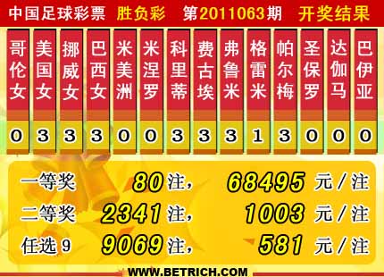 �����й������Ʊ��11063�ڿ���������һ�Ƚ�80ע��ÿע68495Ԫ�����Ƚ�2341ע��ÿע1003Ԫ����������12231350Ԫ����ѡ9������������һ�Ƚ�9069ע��ÿע581Ԫ����������8245582Ԫ��