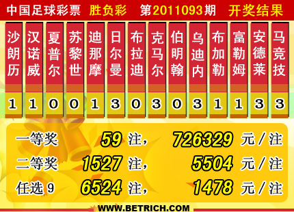 �����й������Ʊʤ���ʵ�11093�ڿ���������һ�Ƚ�59ע��ÿע726329Ԫ�����Ƚ�1527ע��ÿע5504Ԫ����������43775620Ԫ����ѡ9������������һ�Ƚ�6524ע��ÿע1478Ԫ����������15074668Ԫ��
