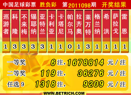 �����й������Ʊ��11098�ڿ���������һ�Ƚ�6ע��ÿע1678814Ԫ�����Ƚ�119ע��ÿע36276Ԫ����������22484120Ԫ����ѡ9������������һ�Ƚ�1318ע��ÿע9209Ԫ����������18965166Ԫ��