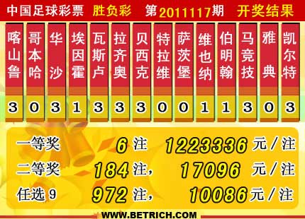 �����й������Ʊ��11117�ڿ���������һ�Ƚ�6ע��ÿע1223336Ԫ�����Ƚ�184ע��ÿע17096Ԫ����������16383968Ԫ����ѡ9������������һ�Ƚ�972ע��ÿע10086Ԫ����������15318902Ԫ��