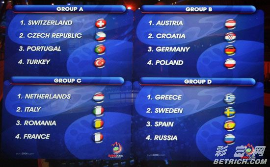 ������ʱ��12��2��19:00(��ʿ����ʱ��12:00)��2008ŷ���������ǩ������ʿ¬�������С�16֧��ӷ�Ϊ4�������ֱ����4��С�顣��������������������������ǽ���C�飬��Ҳ��Ϊ���챭��������֮�顣ͼΪȫ�����������