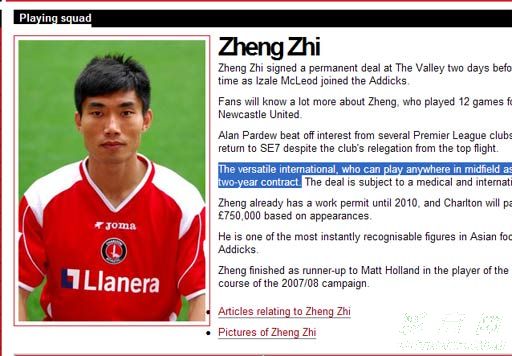 ��������֣�ǵ�����Ҳ��δ���ܴﵽ����ٵ�����Ԥ�ڣ�������Ϊ������ղ���پ��ֲ��ٷ���վ��˵����֣�������ٵĺ�ͬ��ʵֻʣ���һ�ꡣ�ڲ���ٹٷ���վ�й�֣�ǵ���Ա���Ͻ������ᵽ��֣����2007-08������ʼǰ����;��ֲ�ǩ����ͬ������ת��(Zheng Zhi signed a permanent deal at The Valley two days before the start of the 2007/08 season )�����⻹��һ��Ҳ�ᵽ��������ʤ�κ�����ǰ�������ڶ�ǰ��Ķ�Ŷ��յ���Ա�;��ֲ�ǩԼ����(The versatile international, who can play anywhere in midfield as well as a second striker and in defence, has signed a two-year contract. )