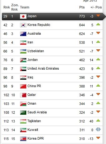 ��������ʱ��4��11�գ�FIFA����4��������������������������98λ����3�·���������11λ���ط�����֮�ڡ��ձ����������Ĵ����ǡ����ʺ����ȱ��˹̹��������ǰ�����������ձ��ӵ�����������Ȼ�µ�3λ����Ȼ�ﵽ�˵�29λ�������������޵�9��