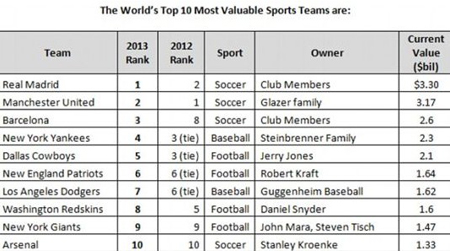 ��������������˹����־���շ�����2013��ȫ����̳���ֲ���ֵ���а������Ż�����33����Ԫ���ܼ�ֵ���Ӱ��ף�Ӣ������������31��7ǧ����Ԫ���ܼ�ֵ��ѷһ�����������ͷ����26����Ԫ������������ǰ10���л�����һ֧������ֲ�����������10�İ�ɭ�ɣ����������ܼ�ֵΪ13��3ǧ����Ԫ�� ������˹����������2013��ȫ����̳����ֲ� ������ݰ��ǡ�����˹����1998����ʼ�����ģ���Ҫ�����̳���о��ֲ��ļ�ֵ���й�������������У������ǰ50������Ҫ������Ҫ���NFL������ְҵ���������ˣ���NBA������ְҵ�������ˣ���NHL������ְҵ��������ˣ���MLB������ְҵ��������ˣ���NASCAR�������˶�������������F1������һ������ʽ���������������7������������ӵĹ��ۡ� 2013�긣��˹��̳��ֵ��ǰ10 �����ڡ�����˹�����ι�������ݰ��У�ǰ50����ӵ�ƽ����ֵԼΪ12.4����Ԫ����ȥ������16%����ֵ����10����Ԫ����ӣ�ȥ����24֧��������ﵽ��33֧��5��ǰ��û���κ�һ֧��ӵ��ܼ�ֵ�ܳ���20����Ԫ�����������5֧��Ӵﵽ��һ�߶ȡ�ǰ50���У�NFL�ϰ���ֲ���࣬Ϊ30֧��������ֲ���MLB��Ϊ7֧��NBA��3֧����ϰ�
