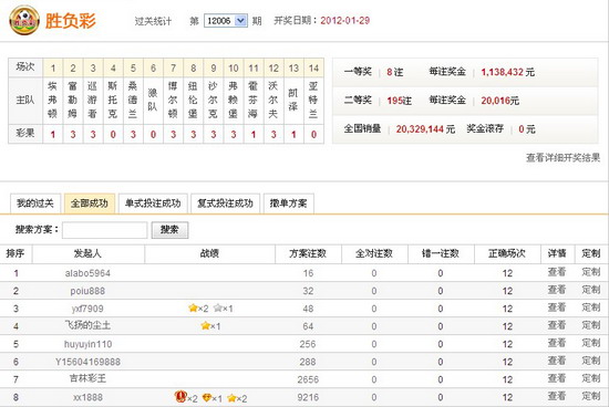 �����й������Ʊ��12006�ڿ���������һ�Ƚ�8ע��ÿע1,138,432 Ԫ�����Ƚ�195ע��ÿע20,016Ԫ����������20,329,144 Ԫ����ѡ9������������һ�Ƚ�30330ע��ÿע248Ԫ����������11,797,426 Ԫ��