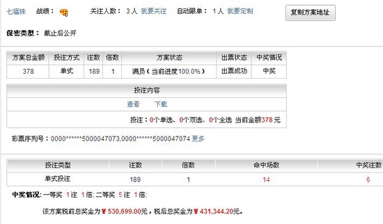��������ʱ��6��04�գ���ʵ�12074�ڿ������������ʤ����һ�Ƚ�����16ע����ע����496,774Ԫ�����Ƚ�502ע����ע����6,785Ԫ����������ʤ���ʣ�17,741,950Ԫ�� ������������Թ���������������Ԥ���Լ�������Ԥ����ɣ�ͨ�������ʹ�31300310330100,���Կ��������������ʹ���������������VS������1-3�Ͱ���VSī����0-2������ܱ��䣬��ʹ�����ܹ��ﵽ��50���ȡ�ͬʱ�й��������Ա���߸��顱������189ע�ĵ�ʽ����ֱ�����б���1עͷ����5ע���Ƚ����ڴ�ȫ����վ��Ա�����ǵ����˻�Ա��ʾף�أ�ͬʱϣ����վ���������������Ļ�Ա����һ�����ܹ�ն��� �����ڻ�Ա���߸��顱��ʽ�����в��ѷ�����Ͷע֮����������VSί�������ı�������ֱ����˫���Ժ�Ϊ����1ֱ�룬ͬʱ�����������������������ű����ڣ�����ˮ�����û�������ʤ������3�����ʹ�����2������������2����189ע�ķ�������������һע���ڴʹ���һ�����н���Ա���߸��顱�ķ����������ݣ� �����ڴŹ��ͬʱ����վ���Ի�Ա��z359968��64ע�ķ���Ϊ��7����Ա���г�13ע���Ƚ����ٴζ����ϻ�Ա���Թ������н����������й���������춼�����ݡ���Ϊ���ص�����������δ�����Ὣ���÷����ṩ�����������ǡ�