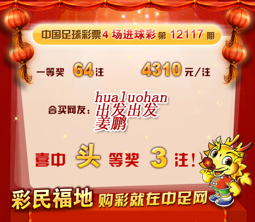 �����й������Ʊ4������ʵ�12117�ڿ���������һ�Ƚ�64ע�� ����4,310Ԫ������������ 431,032Ԫ�� �����ڱ�վ�����У����ѡ�hualuohan�� ������������ ���������ֱ�ϲ��ͷ��1ע�� ������ϲ�н����ѣ� �����ڴ��������Ѽ��뵽��վ����������