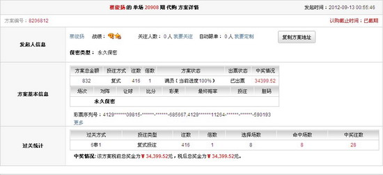 ������������Ա���̿����20908�ڴ��� 832Ԫ ����8����28ע6��1���ܽ���34399.52Ԫ�� �������ʣ���Ա��sdzzy���ھ�������ʤƽ���Ϲ� 1060Ԫ ����8�������ط�ʽ2X1��6X1��7X1��8X1���ܹ��н�ע��Ϊ65ע������30948.42Ԫ��������λ��Ա�ַ����أ�ϲ���ݴ����أ�����С�����Ź�����һ���ľ��� �������4������ʣ���Ա��cl1880�����ij�����12140���Ϲ� 2592Ԫ ����ͷ��25963Ԫ���ٴ�ף��������λ���˻�Ա�� ����