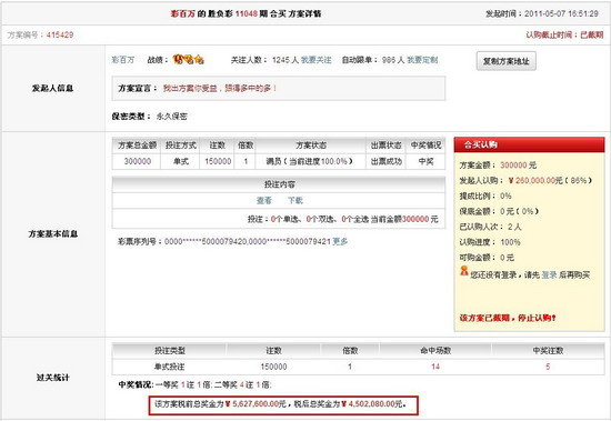 �������ʰ���������ʤ�����ڴη��湲�г�һ�Ƚ�17ע�����Ƚ�499ע�ջƣ�����ʤ����11048�ڷ���ĺ���ϲ�е���һ�Ƚ�1ע�����Ƚ�4ע��ն��5,627,600Ԫ�����Ƕ��߹�ʡ�������11048�ڷ��������ӣ�