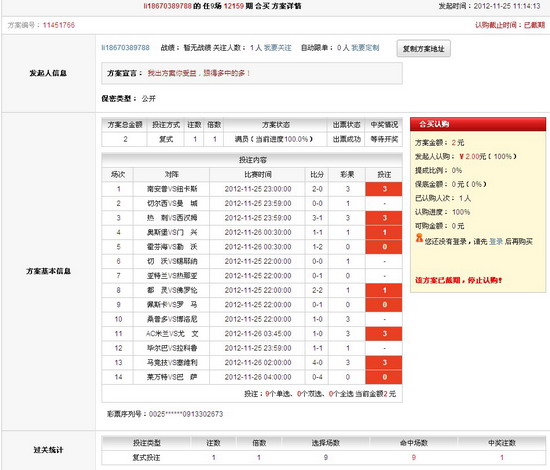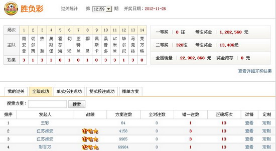 ��������ʱ��11��26���賿��ʤ���ʵ�12159�ھ��±���ȫ��������Ӣ������ս�У��ж���������0-0��ƽ����ױ����У�������������0-1���为�������ǣ�AC������������һ��Сʤ���ģ������������ͳ�δ��ȡʤ�����ױ����У��϶��Ͷ�������սƽ�������������Ի��ʤ�����ڹ���������7��������2����ĩ��5������ŷ��ǶȽ����������0-1��������Ϊ�䡣 �����������ʤ��������22,902,868Ԫ�����ξ�������19,785,242Ԫ��12159��ʤ���ʿ�����һ�Ƚ�8ע������1282560Ԫ�����Ƚ�328ע������13406Ԫ��12159����ѡ�ſ�����һ�Ƚ�2896ע������4372Ԫ����վ���г�8עʤ���ʶ��Ƚ������л�Ա[����]����128Ԫ��������1ע���Ƚ���3������ƽ��ȫȫ���У�Ψ��һ������ʧ�㣬�뱾��ʤ����ͷ����������������������ܹ������Ǵ�������ľ�ϲ�������Ա[���ջ���]2������������6ע���ȣ�ͨ����Աս�����ò�˵��Ա����ʵĵ�ʽ�������Ŷ��صļ��ɡ��������н����������ӣ� �������⣬��վ����ѡ�ŷ��湲�г�59ע�����л�Ա[li18670389788]����2Ԫ�������б�����ѡ��һ�Ƚ�1ע������Ա��Ͷע�п��������İ��������������AC��������ѡ�ij�����3��Ϊ���䣬��С������ɼΣ� ����12159��ʤ���ʱ�վ��Ȼδ�л�Ա�г������������Щ���ʧ֮���۵Ļ�Ա�����ǿ�����ϣ����������һ���������ӵ��ʱ�̣�>>>> �������ж���