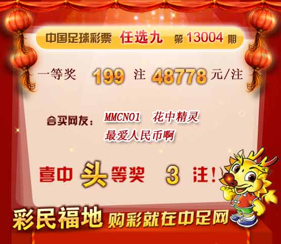 �����й������Ʊ��ѡ9����13004�ڿ���������һ�Ƚ�199ע��ÿע48778Ԫ����������15,167,130Ԫ�� �����ڱ�վ�����У����ѡ�MMCNO1 ���������о��� �����������Ұ� �����˸�ϲ��һ�Ƚ�1ע�� ������ϲ�н����ѣ� �����ڴ��������Ѽ��뵽��վ����������
