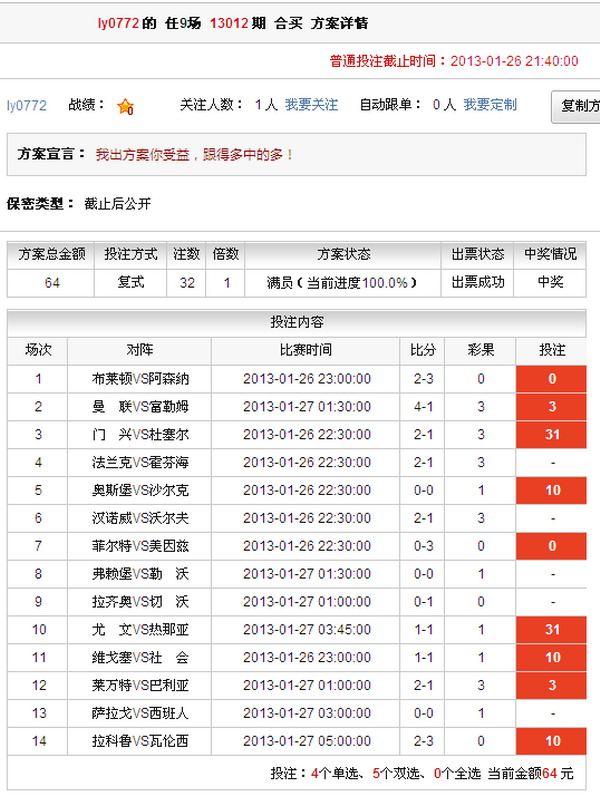 | ��[ͼ��]��13010��ʤ���ʿ��� ��վϲ��һ�Ƚ�1ע 2013-01-27 12:31:00 |