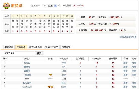 | ��ʤ����13017�ڿ���:һ�Ƚ�46ע��ÿע562993Ԫ 2013-02-04 08:39:00 |