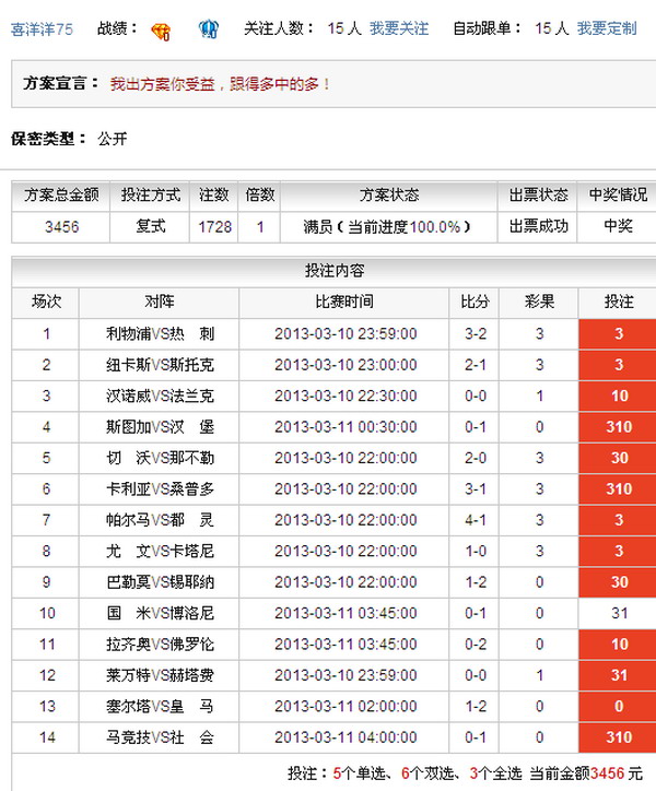 ��������ʱ��3��11�����磬ʤ���ʵ�13036�ڿ������������Ž϶࣬����һ�Ƚ���ȱ�����Ƚ�����59ע����ע����69,925Ԫ��9,626,432.26Ԫ�����������һ�Ƚ����ء�����Ͷע�ܶ�21,487,572Ԫ����վ��Ա��ϲ����75��[���Ƹ���]�еö��Ƚ���ע������14��Ԫ���ش˹�ϲ�� ��������ʤ���ʣ�������������ȫʤ�ɼ����ţ�����ŷ�������������������������ã���������״̬һֱ���õ��Dz���˹Ҳ�ٴ����������16λ�����֣�����˵�����ڵ�ʤ����14������ֹ��һ�����ţ����Ƕೡ�������������ѵ�����£���ϲ����75��Ϭ��Ͷע��ն���������Ͷע����������5����ѡȫ�����ȵ������������������ȴ̣�����Խ���״̬���ѵ��ȴ̼��䲻������Ա�����ƣ����ϵ�ѡ״������ǰ������������ȡʤ�����ȶ��Լ������ף���ѡ��Ψһ�����������������ܱ������Dz���˹������£���Ա�Ƚ���˫ѡ����ȫ�����Ա�˳�����ء� �����������ϻز飬���Ƿ��֣���λ��Ա��ʤ����13003������ù����Ƚ�16ע��һ�Ƚ�1ע������2,057,816.00��˰ǰ��Ԫ�İ���ս�����������ź����꣬����Ա���м���ʤ����ѡ�����ǽ����������ź����������ܴ�������ʧ�����ڣ��ڶ���֮��Ա�ܵ����ģ����̿ڡ����������Ϣ�����Ϻ���Ͷע���еñ��δ� ����ͨ���϶��������������Ѹ�����֤��Ʊ�����ǶIJ��Ľ��ۣ���һ�δ����Լ���������Ժ�Ӧ�ø��ӳ��ȵĻ���ʵ����ͨ�����ϸ��̡��۲죬������Ͷע������ϸ�ļӽ�������̬������ѡ���ȵ�Ͷע���������н�Ч�ʱض����ߣ�ֵ��ѧϰ����� ���������DZ���ʤ������������� ���������DZ���(13036)ʤ���ʱ�վ��Ա��ϲ����75��[���Ƹ���]����չʾ��������ַ���� ����������962�����������ŷ�ڡ�ŷ�����ǹڵ�Ͷע���£������±�������Լ�ϣ����Ա�������ڽ�����˼���£�����ѡ�����⡢������֧�ֵ�ѡ�����Ͷע����ע����ʵʱ���µ�����ǰհ����Ӷ�̬��Ϣ��962��Ԫ���й�������������ĺ��ˣ�ף��ն���