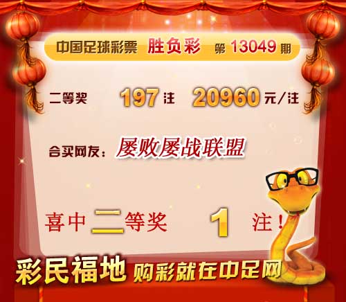 �����й������Ʊ��13049�ڿ���������һ�Ƚ� 7 ע��ÿע 1,376,431Ԫ�����Ƚ� 197 ע��ÿע 20,960 Ԫ���������� 21,506,742 Ԫ�� �����ڱ�վ�����У����ѡ��Ű���ս������ϲ�ж��Ƚ�1ע�� ������ϲ�н����ѣ� �����ڴ��������Ѽ��뵽��վ����������