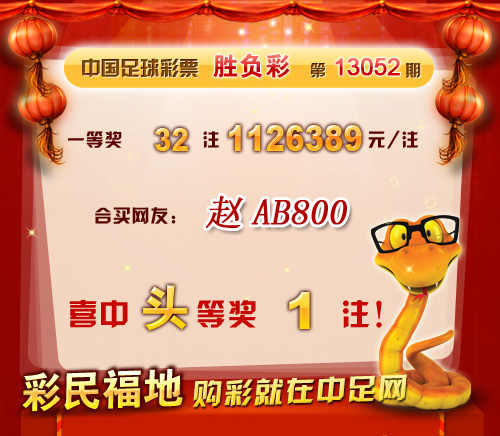 �����й������Ʊ��13052�ڿ���������һ�Ƚ� 32ע��ÿע 1,126,389Ԫ�����Ƚ� 1040ע��ÿע 8,756Ԫ���������� 47,432,590Ԫ�� �����ڱ�վ�����У����ѡ���AB800��ϲ��һ�Ƚ�1ע�� ������ϲ�н����ѣ� �����ڴ��������Ѽ��뵽��վ����������
