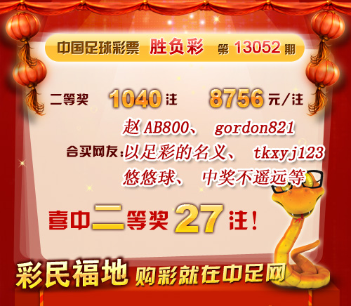 �����й������Ʊ��13052�ڿ���������һ�Ƚ� 32ע��ÿע 1,126,389Ԫ�����Ƚ� 1040ע��ÿע 8,756Ԫ���������� 47,432,590Ԫ�� �����ڱ�վ�����У����ѡ���AB800������gordon821����������ʵ�����������tkxyj123�������������������н���ңԶ�����ڶ����ѹ�ϲ�ж��Ƚ�27ע�� ������ϲ�н����ѣ� �����ڴ��������Ѽ��뵽��վ����������