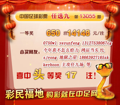 �����й������Ʊ��13055����ѡ9������������һ�Ƚ� 650 ע��ÿע 14,148 Ԫ����������14,369,946 Ԫ�� �����ڱ�վ�����У����ѡ�yeyunfeng������13127538067cg����������֮�������ڶ�����ϲ��һ�Ƚ�17ע�� ������ϲ�н����ѣ� �����ڴ��������Ѽ��뵽��վ����������