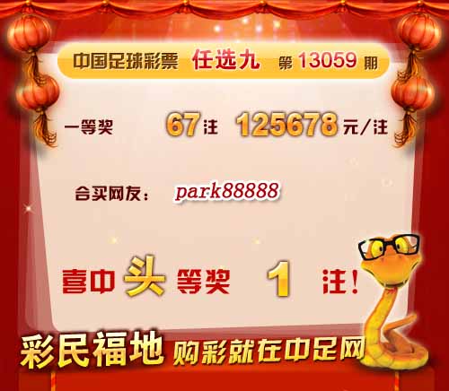 �����й������Ʊ��13059����ѡ9������������һ�Ƚ�67ע��ÿע125678Ԫ����������13,156,994Ԫ�� �����ڱ�վ�����У����ѡ�park88888��ϲ��һ�Ƚ�1ע�� ������ϲ�н����ѣ� �����ڴ��������Ѽ��뵽��վ����������