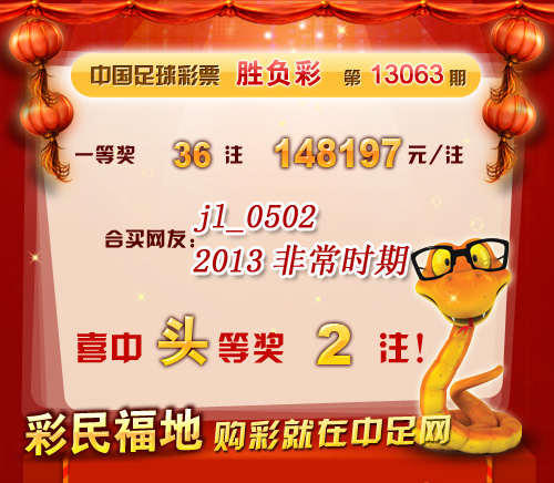 �����й������Ʊ��13063�ڿ���������һ�Ƚ� 36ע��ÿע 148197Ԫ�����Ƚ� 956ע��ÿע 2391Ԫ���������� 11,908,706Ԫ�� �����ڱ�վ�����У����ѡ�jl_0502������2013�dz�ʱ������ϲ��һ�Ƚ�2ע�� ������ϲ�н����ѣ� �����ڴ��������Ѽ��뵽��վ����������