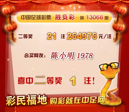 �����й������Ʊ��13068�ڿ���������һ�Ƚ���ȱ�����Ƚ�21 ע��ÿע264976 Ԫ��15,874,518Ԫ���浽����ʤ����ͷ�����ء���������28,981,776 Ԫ�� �����ڱ�վ�����У����ѡ���С��1978��ϲ�ж��Ƚ�1ע�� ������ϲ�н����ѣ� �����ڴ��������Ѽ��뵽��վ����������
