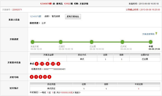 �������ڵ�һ�ʡ����������ϡ������Ҳ��һ�����Σ����ھͼ���ɣ�����2013��6��8�գ��������2013152�ڿ��������ڿ�������Ϊ��43824��ȫ���г�37עͷ������վ�н����صijƺ������鴫���û���12345678Ұ��ͨ������ʽͶע��ͷ��һע��ƾ��2Ԫ����10���н��ر��ʸߴ�5���ڴ˹�ϲ�û�Աϲ���ϣ���ܹ��ٽ���������ø��ཱ��