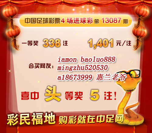 �����й������Ʊ4������ʵ�13087�ڿ���������һ�Ƚ�338 ע��ÿע1,401 Ԫ������������740,322 Ԫ�� �����ڱ�վ�����У����ѡ�iamon������mingzhu520530������a18673999������������ү������baoluo888����λ���ѹ�ϲ��һ�Ƚ�5ע�� ������ϲ�н����ѣ� �����ڴ��������Ѽ��뵽��վ����������