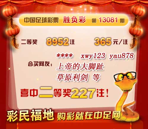 �����й������Ʊ��13081�ڿ���������һ�Ƚ� 423 ע��ÿע 18,057 Ԫ�����Ƚ� 8952 ע��ÿע 365 Ԫ����������17,050,168 Ԫ�� �����ڱ�վ�����У�ϲ�ж��Ƚ�227ע�������н������鿴��ʤ���ʹ���ͳ���� ������ϲ�н����ѣ� �����ڴ��������Ѽ��뵽��վ����������