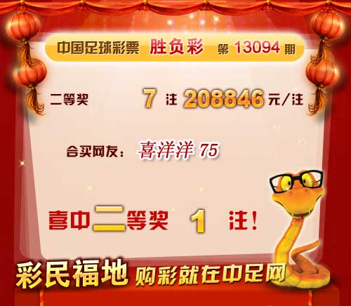 �����й������Ʊ��13094�ڿ���������һ�Ƚ���ȱ������ 3,411,156 Ԫ�����Ƚ� 7 ע��ÿע 208,846 Ԫ���������� 7,614,188 Ԫ�� �����ڱ�վ�����У�ϲ��ͷ��1ע�������н������鿴��ʤ���ʹ���ͳ���� ������ϲ�н����ѣ� �����ڴ��������Ѽ��뵽��վ����������