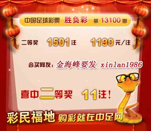 �����й������Ʊ��13100�ڿ���������һ�Ƚ� 55 ע��ÿע75779Ԫ�����Ƚ� 1501 ע��ÿע 1190Ԫ����������9,303,276Ԫ�� �����ڱ�վ�����У�ϲ��ͷ��1ע�������н������鿴��ʤ���ʹ���ͳ���� ������ϲ�н����ѣ� �����ڴ��������Ѽ��뵽��վ��������