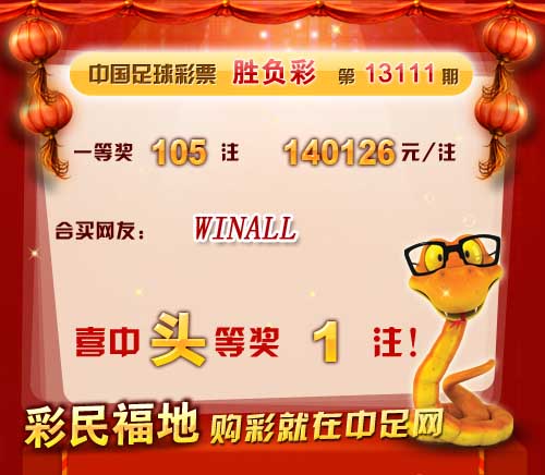 �����й������Ʊ��13111�ڿ���������һ�Ƚ� 105 ע��ÿע 140,126 Ԫ�����Ƚ� 3031 ע��ÿע 1,250 Ԫ�� �����ڱ�վ�����У�ϲ��ͷ��1ע�������н������鿴��ʤ���ʹ���ͳ���� ������ϲ�н����ѣ� �����ڴ��������Ѽ��뵽��վ��������