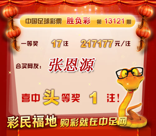 �����й������Ʊ��13121��ʤ��14������������һ�Ƚ� 17 ע��ÿע 217,177 Ԫ�����Ƚ� 772 ע��ÿע 2,049 Ԫ����������8,241,122Ԫ�� �����ڱ�վ�����У�ϲ��ͷ��1ע�����Ƚ�58ע�������н������鿴��ʤ��������ͳ���� ������ϲ�н����ѣ� �����ڴ��������Ѽ��뵽��վ����������