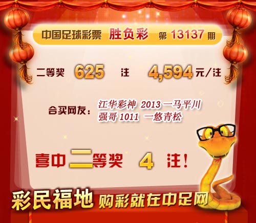 �����й������Ʊ��13137�ڿ���������һ�Ƚ� 26ע��ÿע255,190Ԫ�����Ƚ� 625ע��ÿע 4,549 Ԫ����������14,810,142Ԫ�� �����ڱ�վ�����У�ϲ��ͷ��2ע�����Ƚ�4ע�������н������鿴��ʤ���ʹ���ͳ���� ������ϲ�н����ѣ� �����ڴ��������Ѽ��뵽��վ��������