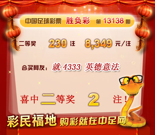 �����й������Ʊ��13138�ڿ���������һ�Ƚ�7 ע��ÿע640,097 Ԫ�����Ƚ�230 ע��ÿע8,349 Ԫ����������10,001,518 Ԫ�� �����ڱ�վ�����У�ϲ�ж��Ƚ�2ע�������н������鿴��ʤ���ʹ���ͳ���� ������ϲ�н����ѣ� �����ڴ��������Ѽ��뵽��վ��������!