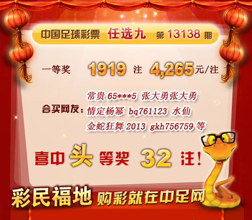 �����й������Ʊ��13138����ѡ9������������һ�Ƚ�1919 ע��ÿע4,265 Ԫ����������12,791,334 Ԫ�� �����ڱ�վ�����У�ϲ��ͷ��32ע�������н������鿴����ѡ�Ź���ͳ���� ������ϲ�н����ѣ� �����ڴ��������Ѽ��뵽��վ����������