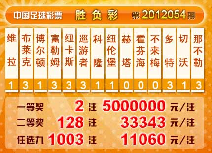 �����й������Ʊ��12054�ڿ���������һ�Ƚ�2ע��ÿע5000000Ԫ�����Ƚ�128 ע��ÿע33343Ԫ��3168088.2Ԫ��������ͷ�����ء���������22228682Ԫ����ѡ9������������һ�Ƚ�1003ע��ÿע11060Ԫ����������17334652Ԫ��