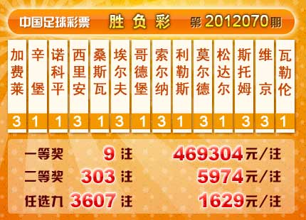 �����й������Ʊ��2012070�ڿ���������һ�Ƚ�9ע��ÿע469304Ԫ�����Ƚ�303ע��ÿע5974Ԫ����������9427998Ԫ����ѡ9������������һ�Ƚ�3607ע��ÿע1629Ԫ����������9183592Ԫ��