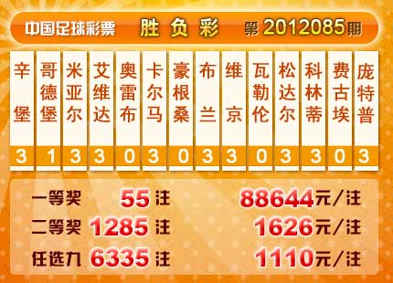 �����й������Ʊ��12085�ڿ���������һ�Ƚ�55ע��ÿע88644Ԫ, ����1285ע����ע����1626Ԫ���������� 10,882,700Ԫ����ѡ9������������һ�Ƚ�6335ע��ÿע1110Ԫ���������� 10,996,632Ԫ��