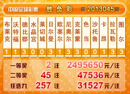 �����й������Ʊ��13043�ڿ���������һ�Ƚ�2ע��ÿע2495650Ԫ�����Ƚ�45ע��ÿע47536Ԫ���������� 11,141,298 Ԫ����ѡ9������������һ�Ƚ�257ע��ÿע31527Ԫ���������� 12,660,334 Ԫ��
