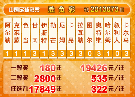 �����й������Ʊ��13073�ڿ���������һ�Ƚ� 180ע��ÿע 19426Ԫ�����Ƚ� 2800ע��ÿע 535Ԫ���������� 7,805,254Ԫ����ѡ9������������һ�Ƚ� 17849ע��ÿע 322Ԫ���������� 8,994,800Ԫ��
