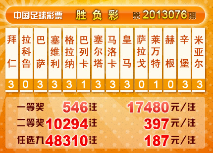 �����й������Ʊ��13076�ڿ���������һ�Ƚ� 546ע��ÿע 17480Ԫ�����Ƚ� 10294ע��ÿע 397Ԫ���������� 21,304,874Ԫ����ѡ9������������һ�Ƚ� 48310ע��ÿע 187Ԫ���������� 14,117,150Ԫ��