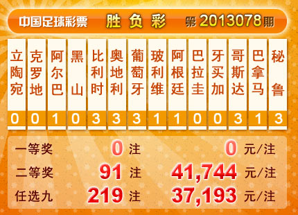 �����й������Ʊ��13078�ڿ���������һ�Ƚ���ȱ��12,359,268Ԫ���浽����ʤ����ͷ�����ء����Ƚ�91 ע��ÿע41,744 Ԫ����������19,785,376 Ԫ����ѡ9������������һ�Ƚ�219 ע��ÿע37,193 Ԫ����������12,727,112 Ԫ��