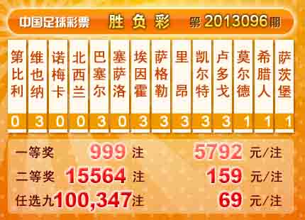 �����й������Ʊ��13096�ڿ���������һ�Ƚ�999ע��ÿע5,792Ԫ�����Ƚ�15564ע��ÿע159Ԫ����������12,917,036 Ԫ����ѡ9������������һ�Ƚ�100,347ע��ÿע69Ԫ����������10,853,472Ԫ��