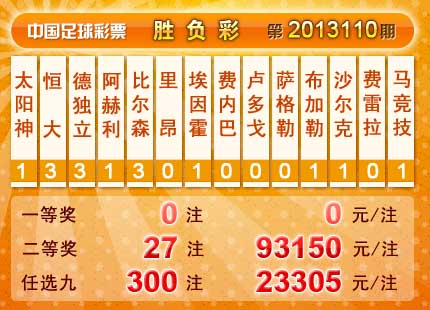 �����й������Ʊ��13110�ڿ���������һ�Ƚ���ȱ������ 5,868,491 Ԫ�����Ƚ� 27 ע��ÿע 93,150 Ԫ���������� 13,099,312 Ԫ����ѡ9������������һ�Ƚ� 300 ע��ÿע 23,305 Ԫ���������� 10,924,252 Ԫ��